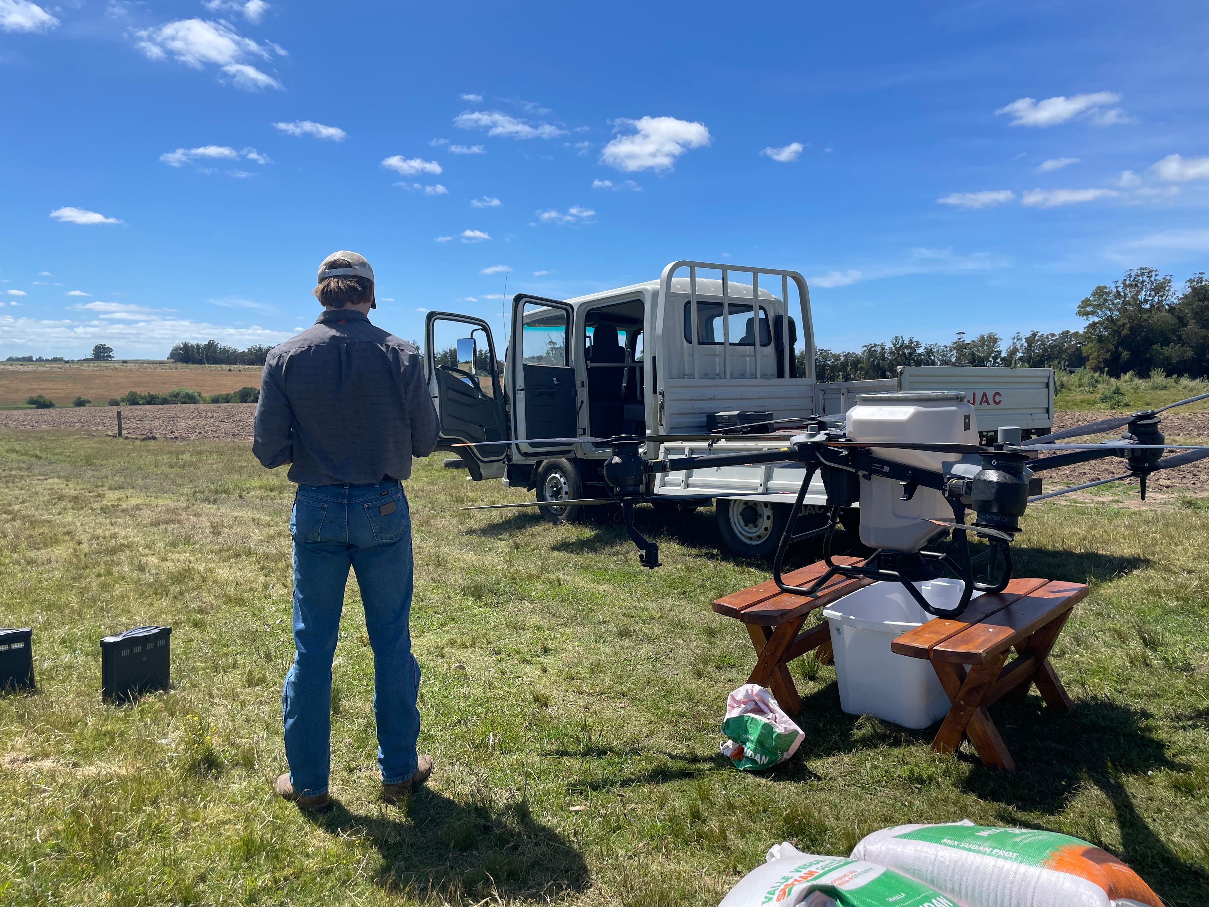 The Agras T40 drone can hold up to 50kgs, but I only poured 25kgs in the tank to be 100% sure we were hitting the mark. With only 4 passes with the drone (each pass being less than 6 minutes) we precisely spread 100kgs of seed over 4 hectares. If we’re counting the time it took to switch out batteries and add more seed to the tank, it was probably a 45 minute operation.