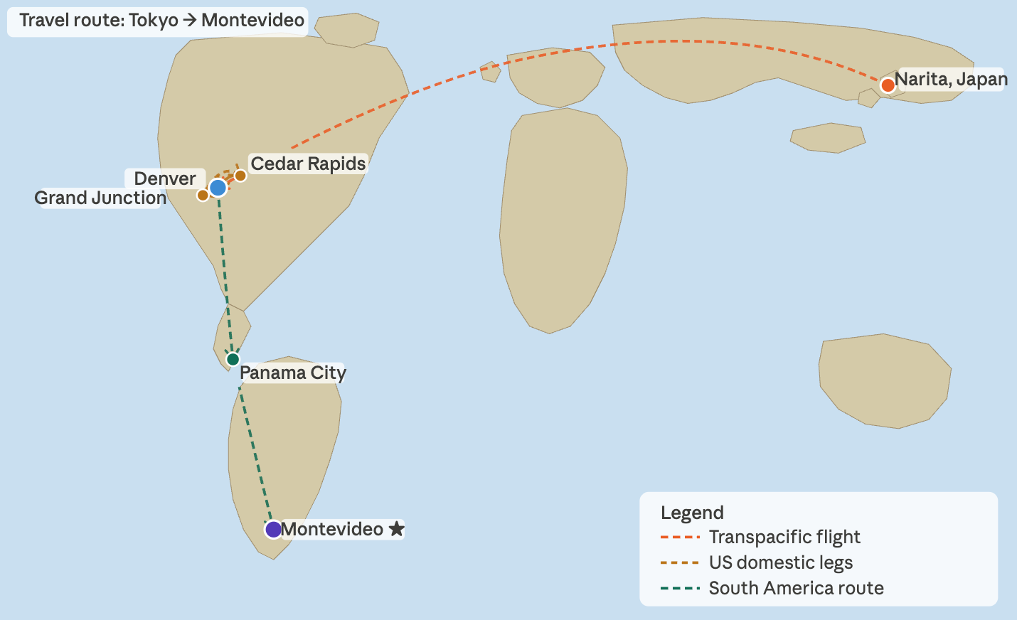 Posted above is a map of everywhere I’ve travelled in the last month along with the path of travel. The Japan to Denver line is technically incorrect since we flew the opposite (and easier) way around the world. Anyway, this map accounts for nearly 40 hours of travel in planes and about the same in driving from Denver to Grand Junction to Cedar Rapids Iowa to Illinois…then all the way back to Denver.